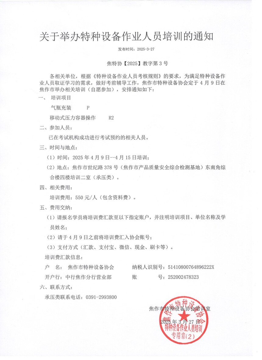 关于举办特种设备作业人员培训的通知 发布时间:2025-3-27 焦特协【2025】教字第3号 各相关单位,根据《特种设备作业人员考核规则》的要求,为满足特种设备作业人员取证学习的需求,做好考前辅导工作,焦作市特种设备协会定于4月9日在焦作市举办相关培训(自愿参加),安排通知如下: 气瓶充装 P 移动式压力容器操作 R2 二、参加人员: 已在考试机构成功进行考试预约的相关人员。 三、时间与地点: (1)时间:2025年4月9日--4月15日培训; (2)地点:焦作市世纪路378号(焦作市产品质量安全综合检测基地)东南角综合楼四楼培训二室(承压类)。 四、相关费用: 培训费用:550元/人(包含资料费)。 五、费用交纳: (1)请报名学员将培训费汇款至以下指定账户,并注明培训项目、单位名称及学员姓名; (2)请于4月9日之前将培训费汇入协会账号; (3)支付方式(汇款、支付宝、微信、现金、刷卡等)。 培训费汇款信息: 户 名: 焦作市特种设备协会 纳税人识别号:51410800764896222X 开户行:中行焦作分行营业部 账号:252002478323 六、联系方式: 承压类联系电话:0391-2993800 焦作市特种设备协会培训室 2025年3月27日 |