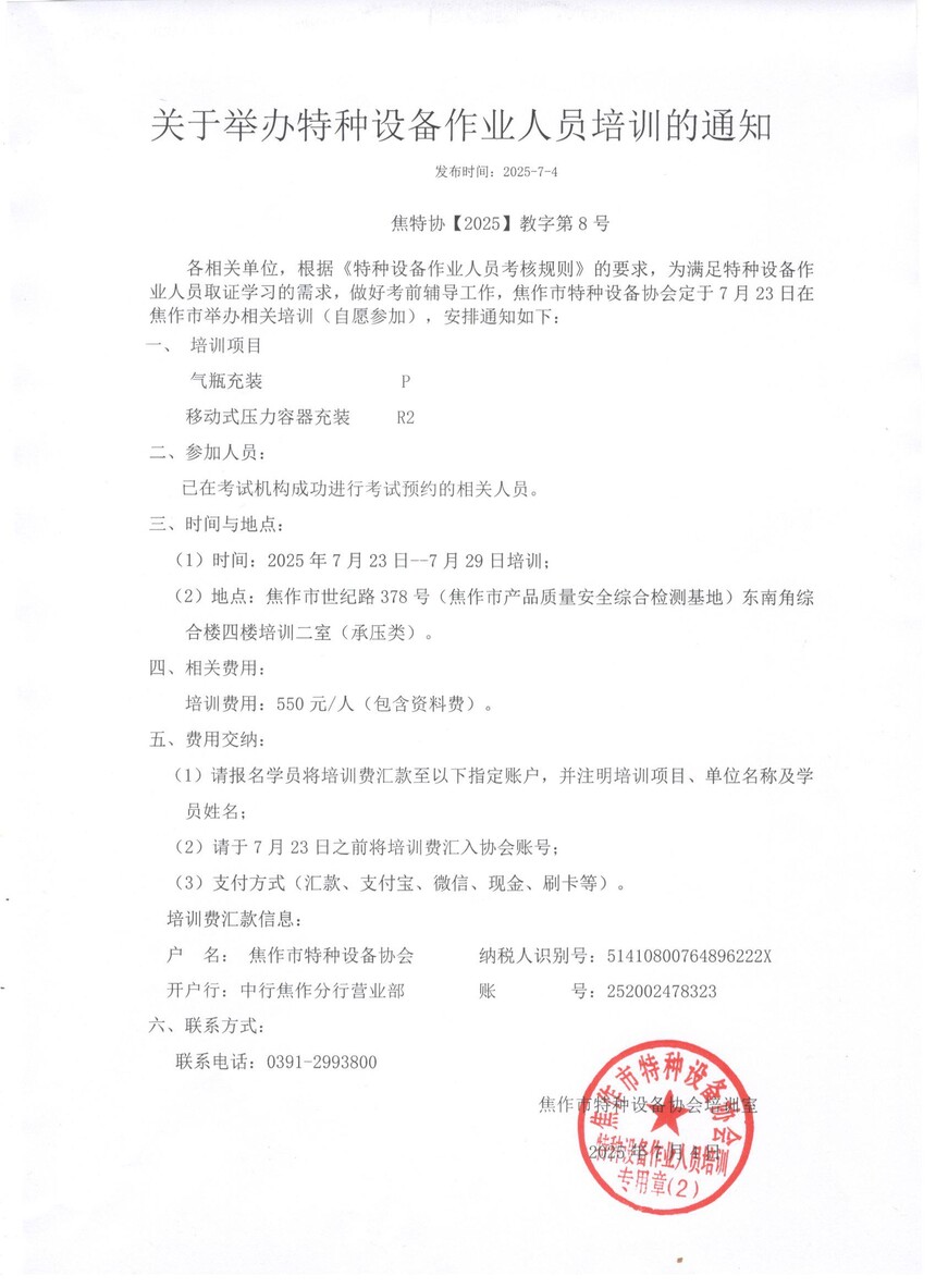 关于举办特种设备作业人员培训的通知 发布时间:2025-7-4 焦特协【2025】教字第8号 各相关单位,根据《特种设备作业人员考核规则》的要求,为满足特种设备作业人员取证学习的需求,做好考前辅导工作,焦作市特种设备协会定于7月23日在焦作市举办相关培训(自愿参加),安排通知如下: 气瓶充装 P 移动式压力容器充装 R2 二、参加人员: 已在考试机构成功进行考试预约的相关人员。 三、时间与地点: (1)时间:2025年7月23日--7月29日培训; (2)地点:焦作市世纪路378号(焦作市产品质量安全综合检测基地)东南角综合楼四楼培训二室(承压类)。 四、相关费用: 培训费用:550元/人(包含资料费)。 五、费用交纳: (1)请报名学员将培训费汇款至以下指定账户,并注明培训项目、单位名称及学员姓名; (2)请于7月23日之前将培训费汇入协会账号; (3)支付方式(汇款、支付宝、微信、现金、刷卡等)。 培训费汇款信息: 户 名: 焦作市特种设备协会 纳税人识别号:51410800764896222X 开户行:中行焦作分行营业部 账号:252002478323 六、联系方式: 联系电话:0391-2993800 焦作市特种设备协会培训室 2025年7月4日 |