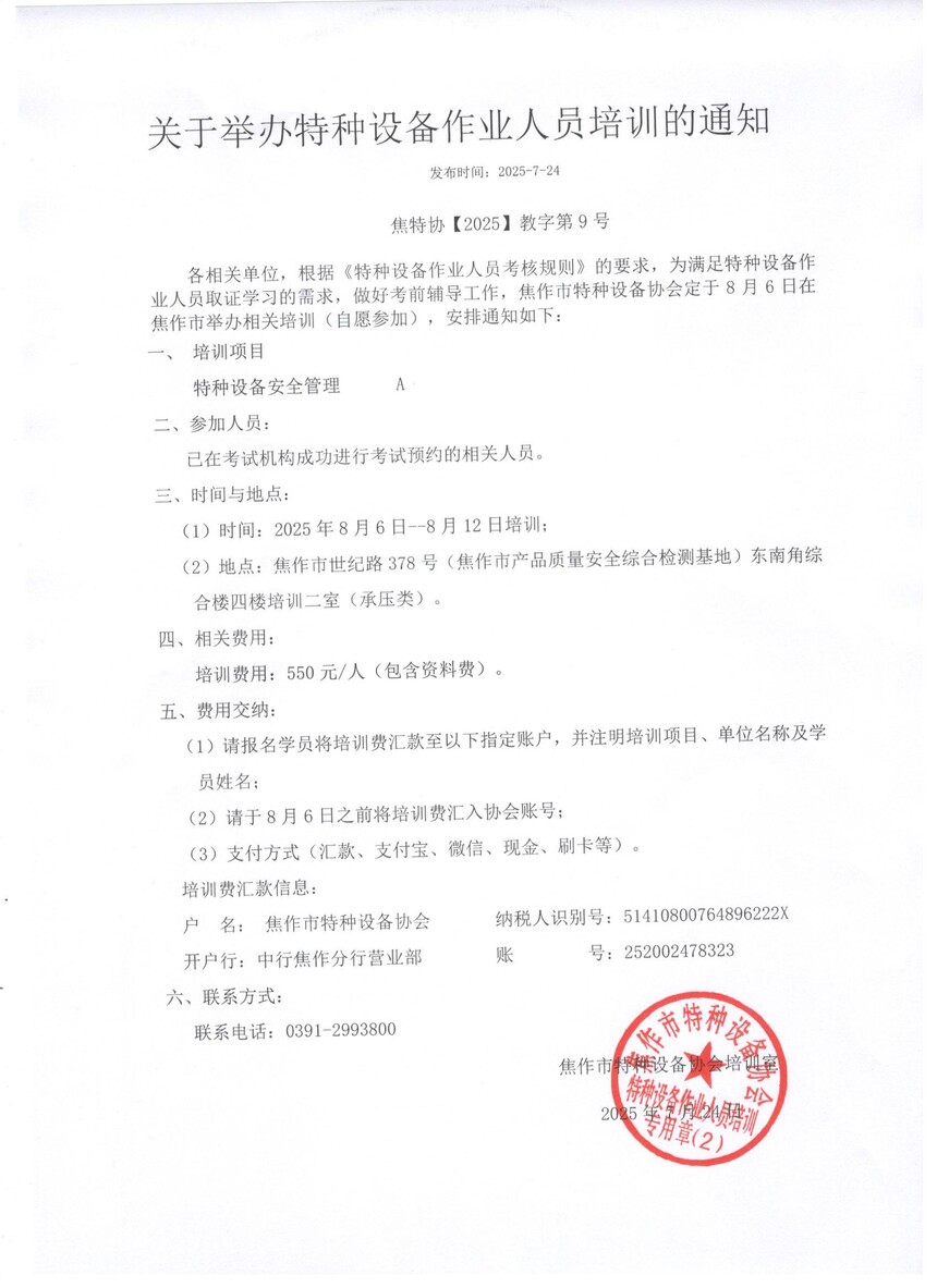 关于举办特种设备作业人员培训的通知 发布时间:2025-7-24 焦特协【2025】教字第9号 各相关单位,根据《特种设备作业人员考核规则》的要求,为满足特种设备作业人员取证学习的需求,做好考前辅导工作,焦作市特种设备协会定于8月6日在焦作市举办相关培训(自愿参加),安排通知如下: 特种设备安全管理 A 二、参加人员: 已在考试机构成功进行考试预约的相关人员。 三、时间与地点: (1)时间:2025年8月6日--8月12日培训; (2)地点:焦作市世纪路378号(焦作市产品质量安全综合检测基地)东南角综合楼四楼培训二室(承压类)。 四、相关费用: 培训费用:550元/人(包含资料费)。 五、费用交纳: (1)请报名学员将培训费汇款至以下指定账户,并注明培训项目、单位名称及学员姓名; (2)请于8月6日之前将培训费汇入协会账号; (3)支付方式(汇款、支付宝、微信、现金、刷卡等)。 培训费汇款信息: 户 名: 焦作市特种设备协会 纳税人识别号:51410800764896222X 开户行:中行焦作分行营业部 账号:252002478323 六、联系方式: 联系电话:0391-2993800 焦作市特种设备协会培训室 2025年7月24日 |