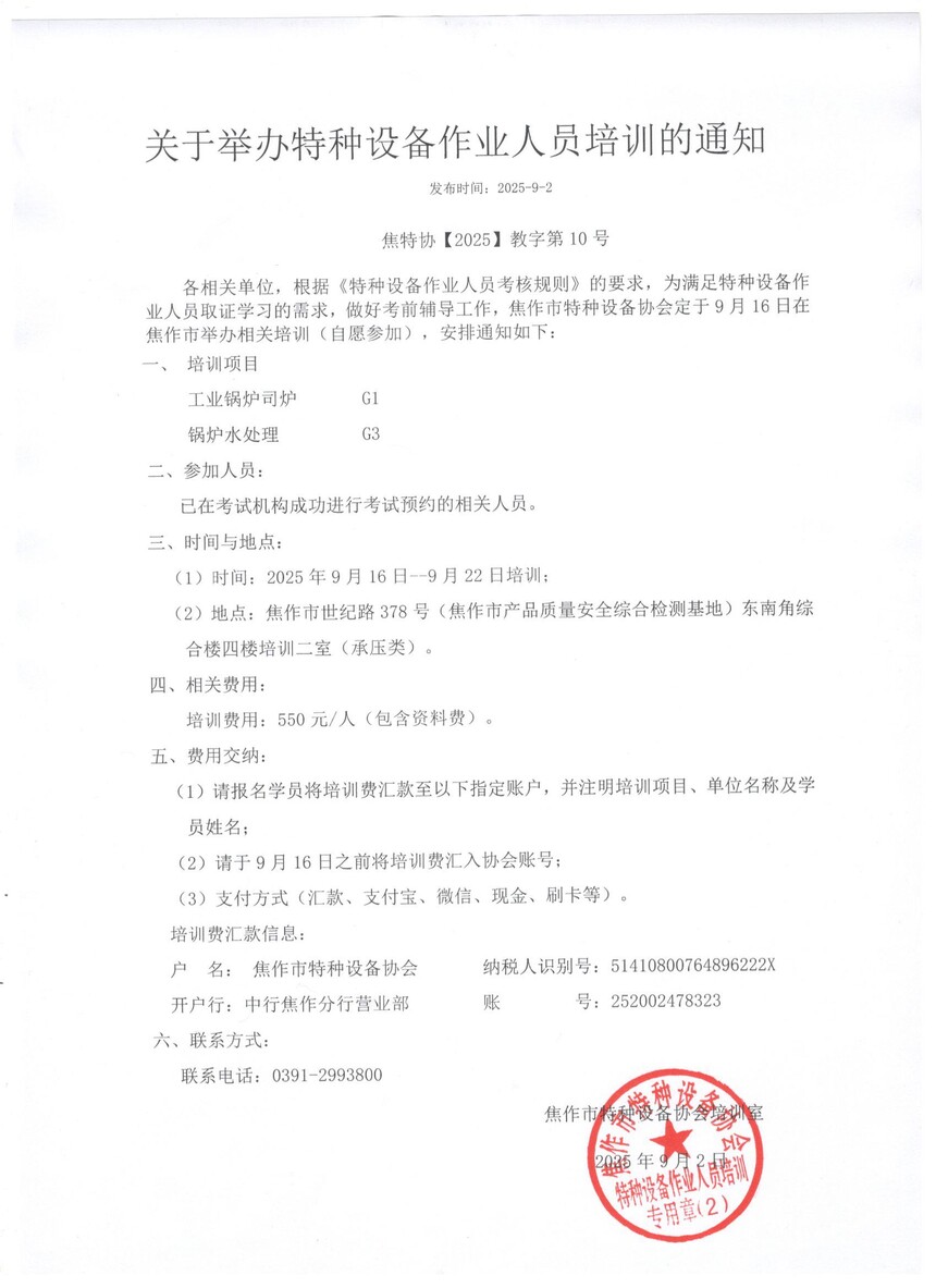 关于举办特种设备作业人员培训的通知 发布时间:2025-9-2 焦特协【2025】教字第10号 各相关单位,根据《特种设备作业人员考核规则》的要求,为满足特种设备作业人员取证学习的需求,做好考前辅导工作,焦作市特种设备协会定于9月16日在焦作市举办相关培训(自愿参加),安排通知如下: 工业锅炉司炉 G1 锅炉水处理 G3 二、参加人员: 已在考试机构成功进行考试预约的相关人员。 三、时间与地点: (1)时间:2025年9月16日--9月22日培训; (2)地点:焦作市世纪路378号(焦作市产品质量安全综合检测基地)东南角综合楼四楼培训二室(承压类)。 四、相关费用: 培训费用:550元/人(包含资料费)。 五、费用交纳: (1)请报名学员将培训费汇款至以下指定账户,并注明培训项目、单位名称及学员姓名; (2)请于9月16日之前将培训费汇入协会账号; (3)支付方式(汇款、支付宝、微信、现金、刷卡等)。 培训费汇款信息: 户 名: 焦作市特种设备协会 纳税人识别号:51410800764896222X 开户行:中行焦作分行营业部 账号:252002478323 六、联系方式: 联系电话:0391-2993800 焦作市特种设备协会培训室 2025年9月2日 |