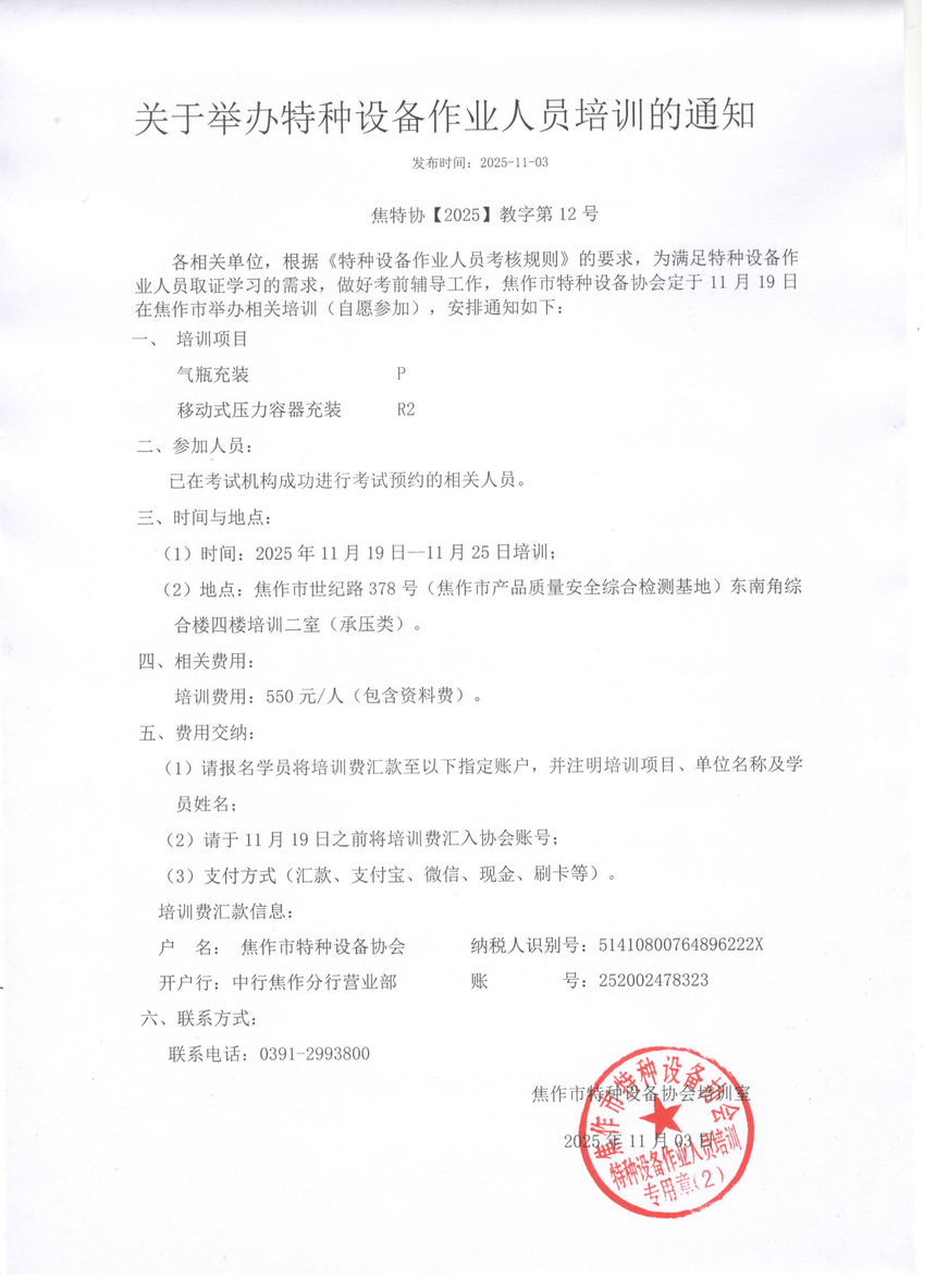 关于举办特种设备作业人员培训的通知 发布时间:2025-11-03 焦特协【2025】教字第12号 各相关单位,根据《特种设备作业人员考核规则》的要求,为满足特种设备作业人员取证学习的需求,做好考前辅导工作,焦作市特种设备协会定于11月19日在焦作市举办相关培训(自愿参加),安排通知如下: 气瓶充装 P 移动式压力容器充装 R2 二、参加人员: 已在考试机构成功进行考试预约的相关人员。 三、时间与地点: (1)时间:2025年11月19日--11月25日培训; (2)地点:焦作市世纪路378号(焦作市产品质量安全综合检测基地)东南角综合楼四楼培训二室(承压类)。 四、相关费用: 培训费用:550元/人(包含资料费)。 五、费用交纳: (1)请报名学员将培训费汇款至以下指定账户,并注明培训项目、单位名称及学员姓名; (2)请于11月19日之前将培训费汇入协会账号; (3)支付方式(汇款、支付宝、微信、现金、刷卡等)。 培训费汇款信息: 户 名: 焦作市特种设备协会 纳税人识别号:51410800764896222X 开户行:中行焦作分行营业部 账号:252002478323 六、联系方式: 联系电话:0391-2993800 焦作市特种设备协会培训室 2025年11月03日 |