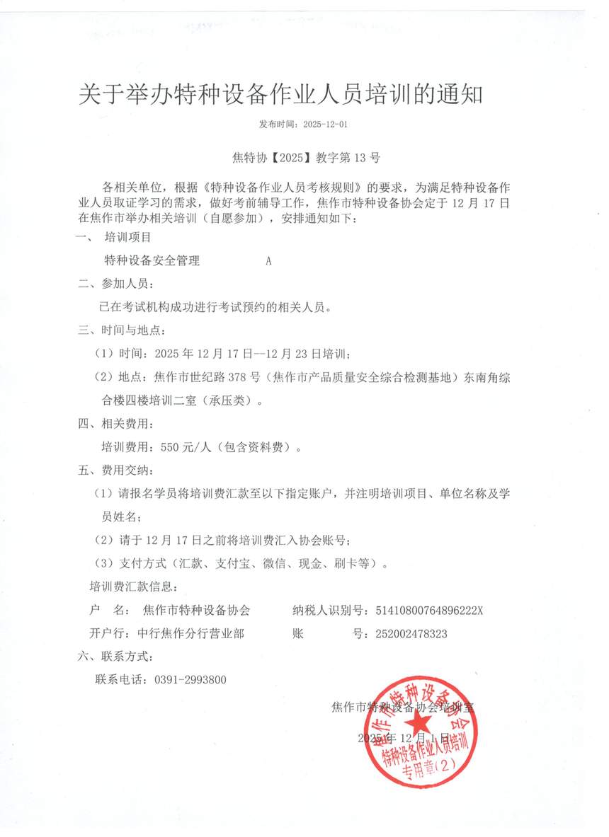 关于举办特种设备作业人员培训的通知 发布时间:2025-12-01 焦特协【2025】教字第13号 各相关单位,根据《特种设备作业人员考核规则》的要求,为满足特种设备作业人员取证学习的需求,做好考前辅导工作,焦作市特种设备协会定于12月17日在焦作市举办相关培训(自愿参加),安排通知如下: 特种设备安全管理 A 二、参加人员: 已在考试机构成功进行考试预约的相关人员。 三、时间与地点: (1)时间:2025年12月17日--12月23日培训; (2)地点:焦作市世纪路378号(焦作市产品质量安全综合检测基地)东南角综合楼四楼培训二室(承压类)。 四、相关费用: 培训费用:550元/人(包含资料费)。 五、费用交纳: (1)请报名学员将培训费汇款至以下指定账户,并注明培训项目、单位名称及学员姓名; (2)请于12月17日之前将培训费汇入协会账号; (3)支付方式(汇款、支付宝、微信、现金、刷卡等)。 培训费汇款信息: 户 名: 焦作市特种设备协会 纳税人识别号:51410800764896222X 开户行:中行焦作分行营业部 账号:252002478323 六、联系方式: 联系电话:0391-2993800 焦作市特种设备协会培训室 2025年12月1日 |